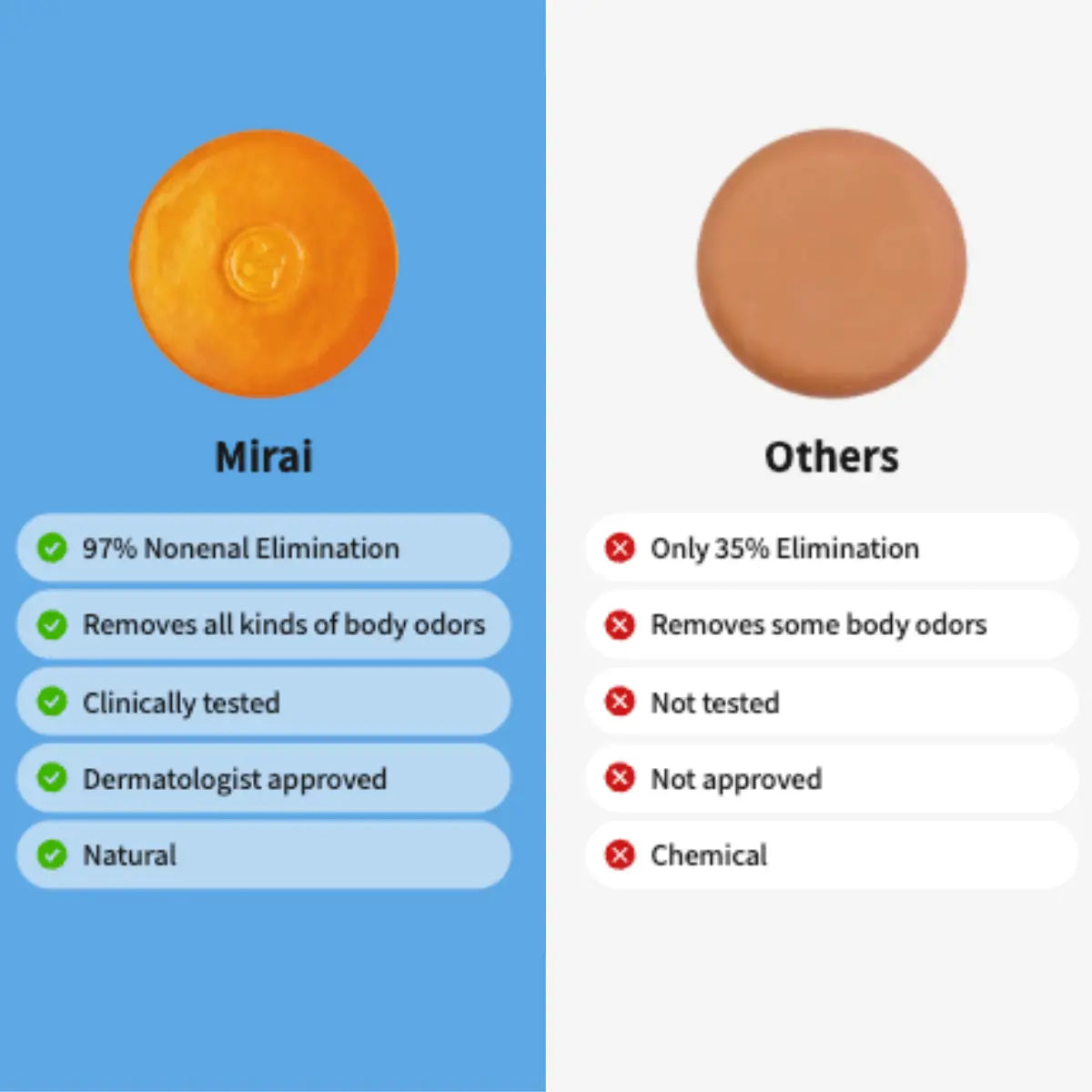 Our Persimmon Soap eliminates Nonenal (by 97% compared to only 35% by conventional soaps), the source of aging body odor referred to as “old person smell”. Unlike other persimmon soaps that use persimmon juice (0.1% tannins), our formula uses a concentrated persimmon tannin extract that is clinically proven to eliminate all types of body odor.