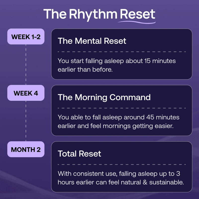 You should expect your sleep window to move forward by about 15 minutes per week. Following the full 90-day protocol usually results in a total shift of ~3 hours, moving you from a 2 AM struggle to an 11 PM natural descent.